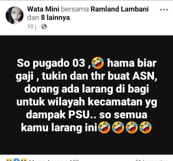 “So pugado 03, hama biar gaji, tukin dan THR buat ASN dorang ada larang dibagi untuk wilayah yang dampak PSU..so samua kamu larang ini?”