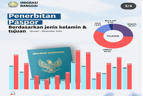 Dari total tersebut, mayoritas penerbitan paspor diperuntukkan untuk perjalanan umrah, yang mencapai 56,6%, jauh lebih tinggi dibandingkan perjalanan wisata yang hanya sekitar 25,7%.