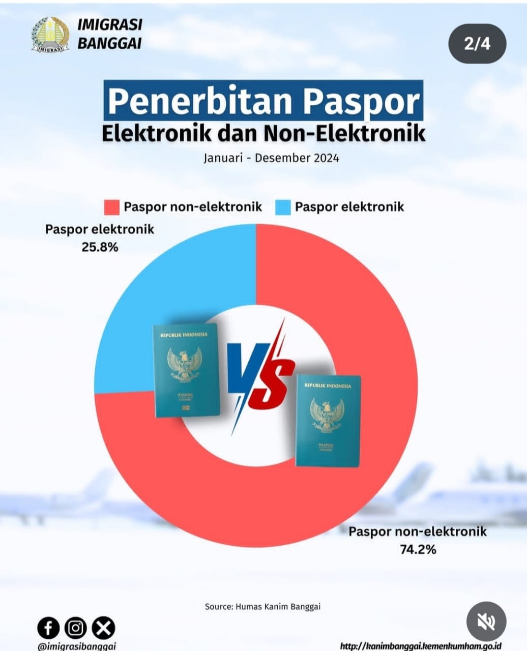 Dalam jenis paspor yang diterbitkan, paspor non-elektronik mendominasi dengan angka 74,2%, sementara paspor elektronik hanya mencapai 25,8% sepanjang tahun 2024.