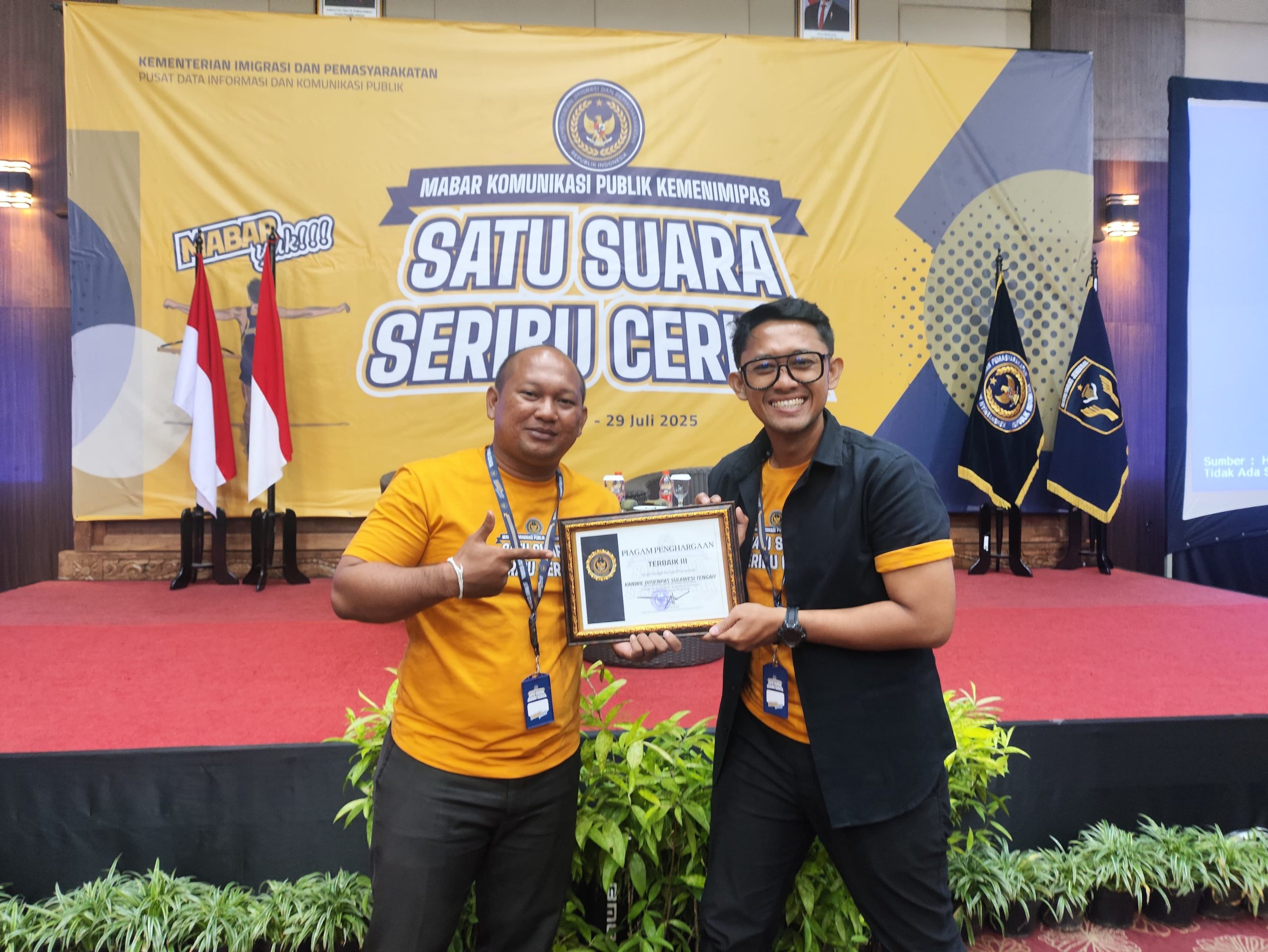 Dalam ajang MABAR (Maju Bareng) Komunikasi Publik Kemenimipas 2025, Kanwil Ditjenpas Sulteng berhasil meraih Penghargaan Terbaik III untuk kategori Kanwil Terproduktif dalam pelaporan 13 Akselerasi Menteri Imigrasi dan Pemasyarakatan.