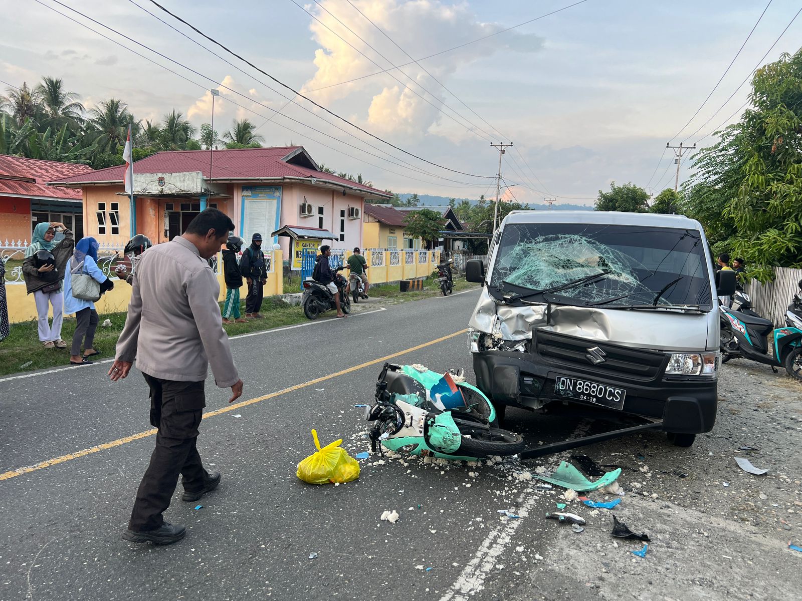 Peristiwa ini berlangsung di Jalan Trans Sulawesi, Kecamatan Kintom, sekitar pukul 17.00 Wita, melibatkan sepeda motor Yamaha Fino DN 5277 RD dengan sebuah mobil pick-up Suzuki Carry DN 8680 CS.