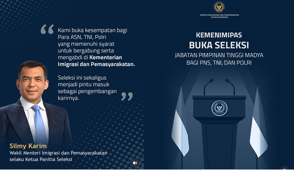 Seleksi ini dapat diikuti oleh seluruh Pegawai Negeri Sipil pusat maupun daerah, prajurit TNI, serta anggota Polri. Pengumuman seleksi dengan Nomor WIP-SA.02,01-3 Tentang Seleksi Terbuka Jabatan Tinggi Madya Di Lingkungan Kementerian Imigrasi dan Pemasyarakatan ditandatangani oleh Wakil Menteri Imigrasi dan Pemasyarakatan Silmy Karim selaku Ketua Panitia Seleksi pada Jumat (25/07/2025) dan dapat dilihat pada laman http://pansel.kemenimipas.go.id