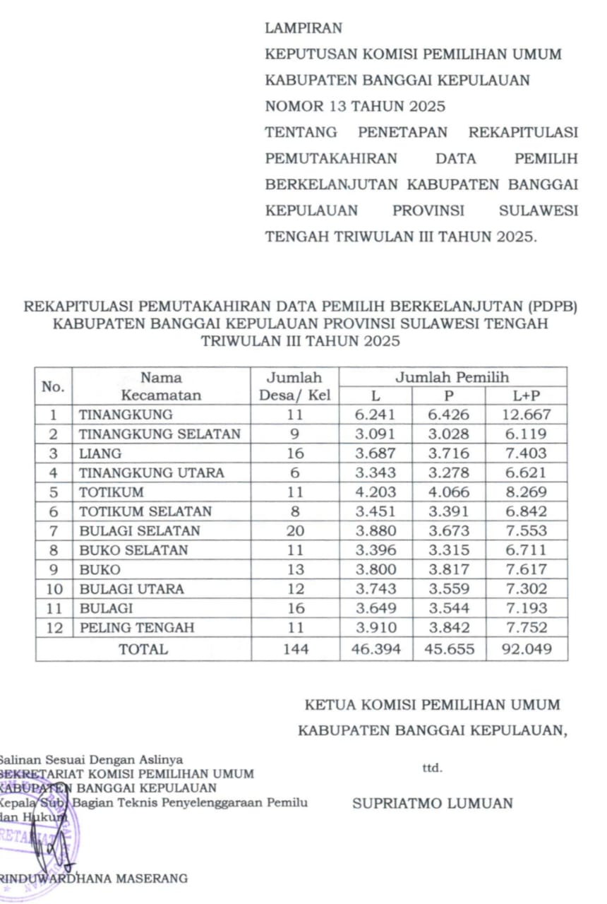 Rekapitulasi pemutahiran data pemilih berkelanjutan (PDPB) kabupaten banggai kepulauan provinsi sulawesi tengah triwulan III tahun 2025.
