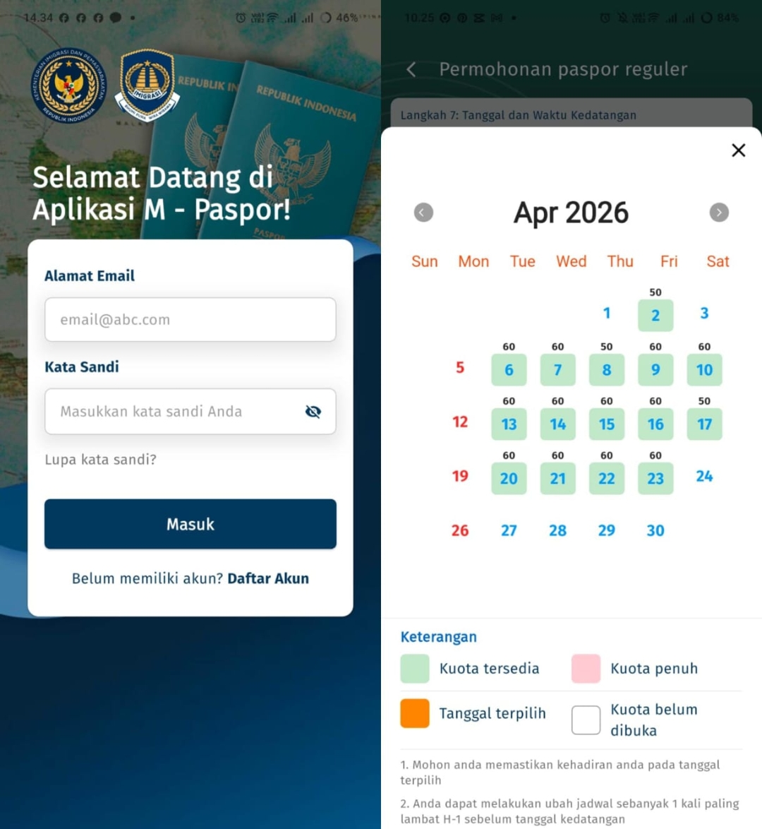 KABAR BANGGAI – Kuota permohonan paspor melalui aplikasi M-Paspor untuk bulan April resmi telah dibuka. Masyarakat diimbau untuk segera melakukan pendaftaran secara online melalui aplikasi M-Paspor guna mendapatkan jadwal pelayanan sesuai dengan waktu yang diinginkan.