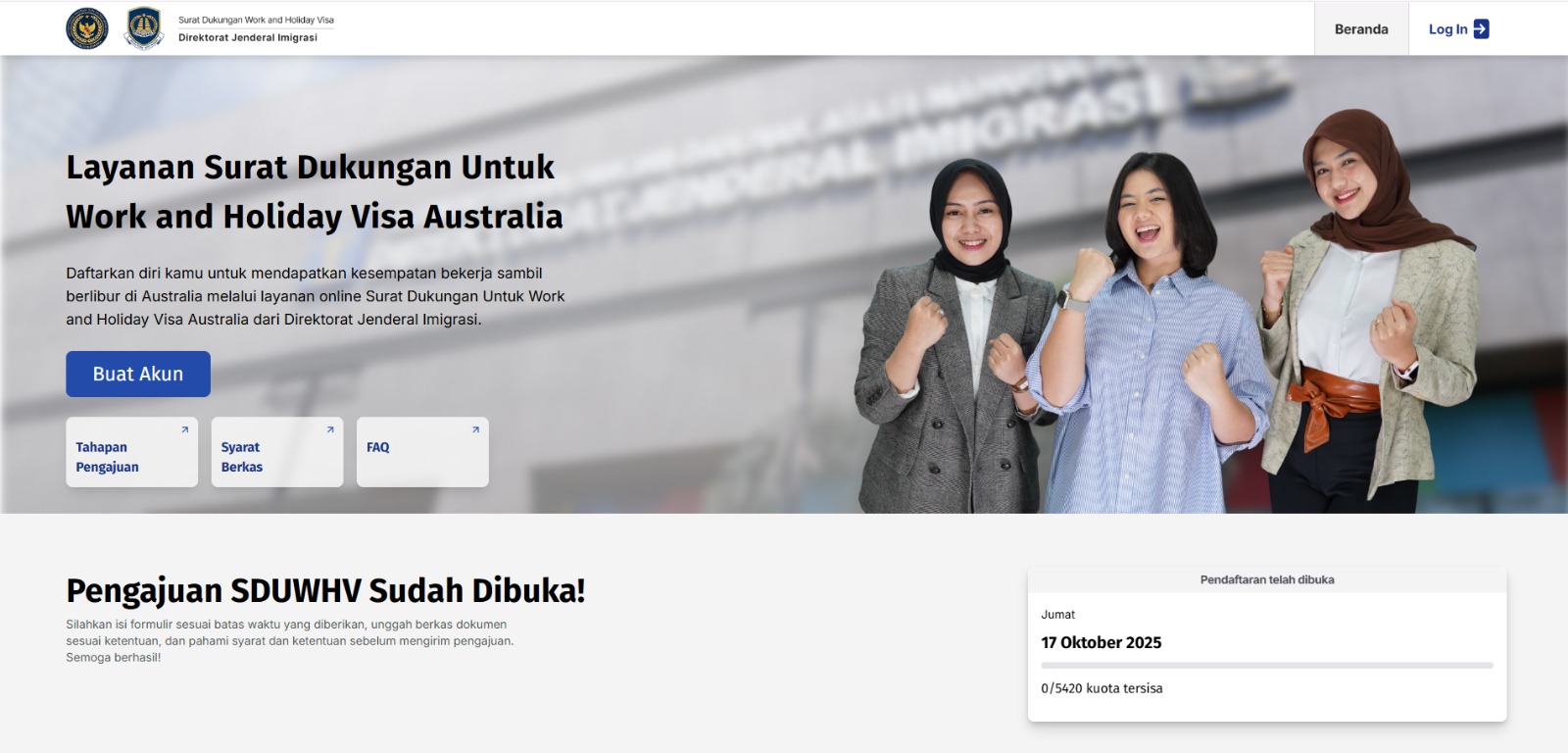 KABAR BANGGAI – Layanan Surat Dukungan Work and Holiday Visa (SDUWHV) resmi dibuka pada Jumat, 17 Oktober 2025 pukul 09.00 WIB dengan 5.420 kuota masih tersedia. Pengajuan dapat dilakukan secara daring melalui sduwhv.imigrasi.go.id