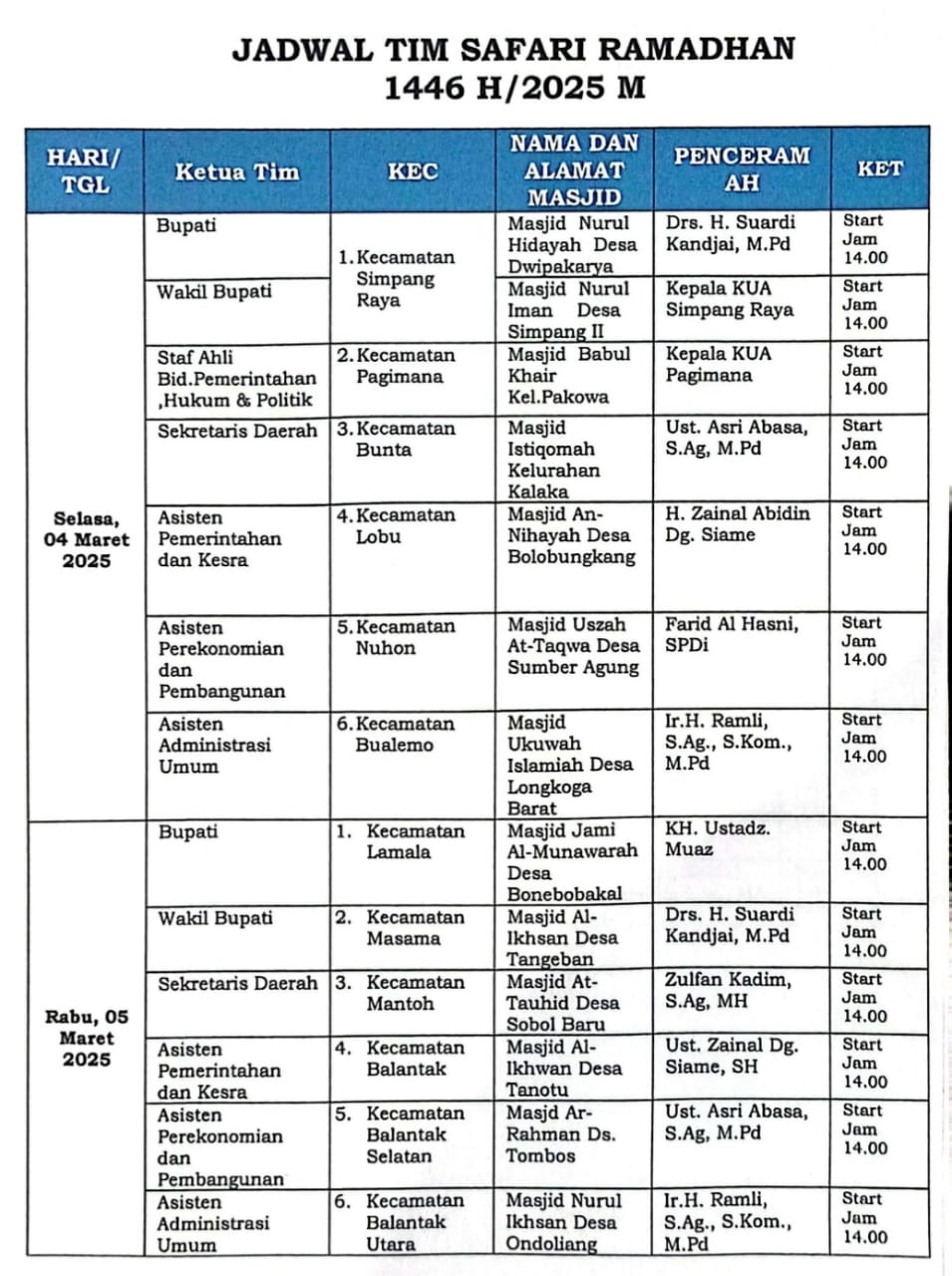 Pada hari pertama, Bupati Amirudin yang tergabung dalam Tim I akan melaksanakan safari Ramadhan di Masjid Nurul Hidayah, Desa Dwipakarya, Kecamatan Simpang Raya. Tausiyah akan dibawakan oleh Kepala Kementerian Agama (Kemenag) Banggai, Drs. H. Suardi Kandjai, M.Pd.