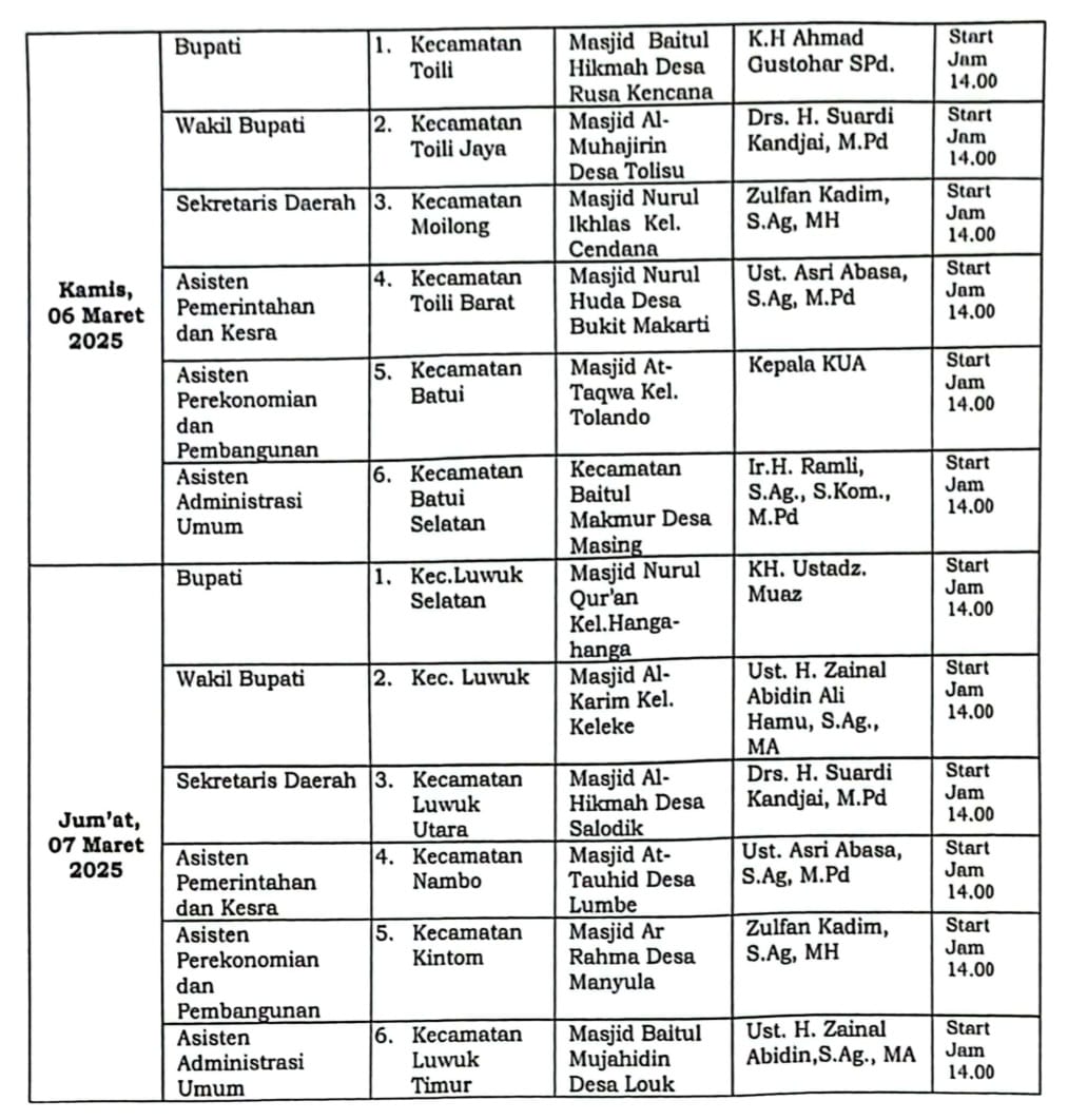 Dalam jadwal yang beredar, Bupati Amirudin akan menggelar safari di Masjid Baitul Hikmah, Desa Rusa Kencana, Kecamatan Toili, sementara Wabup Furqanudin Masulili akan melaksanakan safari di Masjid Muhajirin, Desa Tolisu, Kecamatan Toili Jaya.