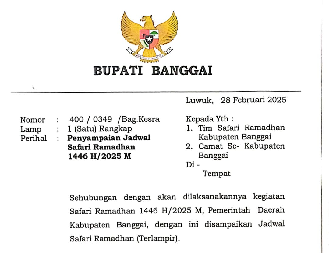 KABAR BANGGAI – Pemerintah Daerah (Pemda) Kabupaten Banggai akan menggelar Safari Ramadhan 1446 H dengan menyasar 24 kecamatan di seluruh wilayah Banggai. Kegiatan ini telah dijadwalkan berlangsung mulai 4 Maret hingga 7 Maret 2025 dengan membagi enam tim yang akan bergerak secara bersamaan.