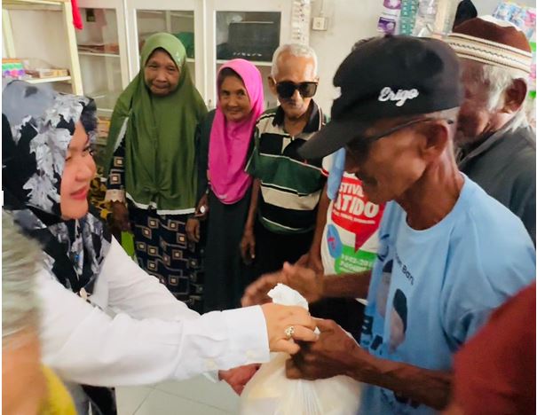 Kedatangan putri Almarhum H.Murad Husain itu disambut haru ratusan warga yang memadati lokasi pendistribusian bantuan.