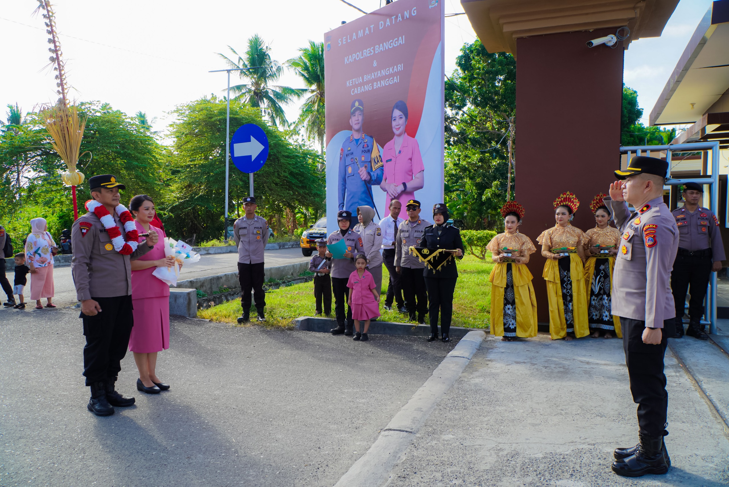 KABAR  BANGGAI  –  Polres Banggai menggelar tradisi penyambutan Kapolres Banggai baru AKBP Wayan Wayracana Aryawan, SIK, bersama Ketua Bhayangkari Cabang Banggai Ny. Made Wayan di Mapolres Banggai, Sabtu (10/1/2026).