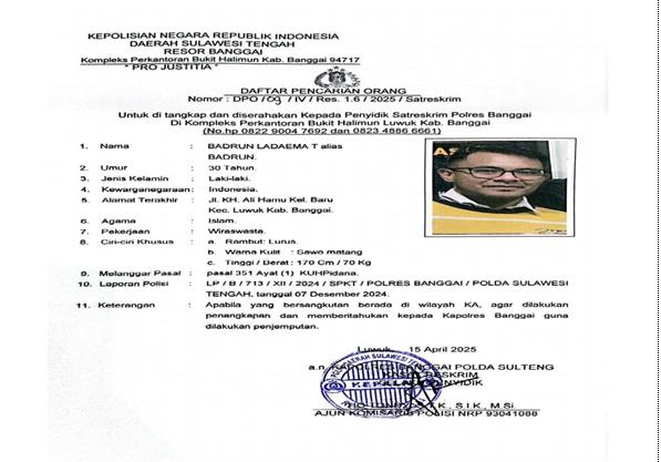 Kasat Reskrim Polres Banggai, AKP Tio Tondy, menjelaskan bahwa penetapan status DPO terhadap Badrun tertuang dalam Surat Nomor: DPO/09/IV/Res.1.6/2025/Satreskrim. Adapun dasar hukumnya adalah Laporan Polisi Nomor: LP/B/713/XII/2024/SPKT/Res Banggai/Polda Sulteng, yang dibuat pada 7 Desember 2024.